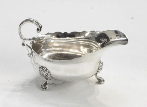 George VI silver sauce boat, oval with cut card borders, free scroll handle, three hoof feet, London 1939 4oz approx.