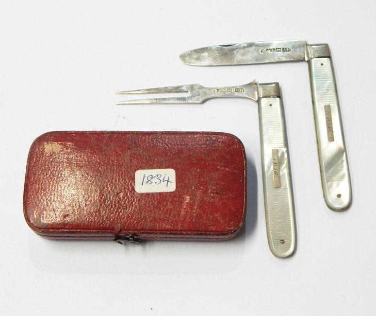 William IV silver folding fruit knife and fork set with reeded mother-of-pearl handles, Sheffield 1831, by Aaron Hadfield, in red leather case