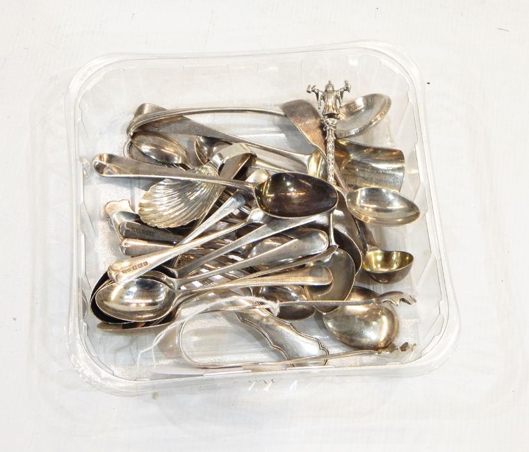 George III silver caddy spoon by Elizabeth Morley, London 1797 with fluted shell bowl and plain handle and quantity of other silver including sugar tongs, teaspoons, etc.