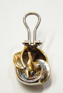 Pair 18ct white and yellow gold double-loop knot-pattern earrings with post and hinge fittings, 14g approx.