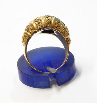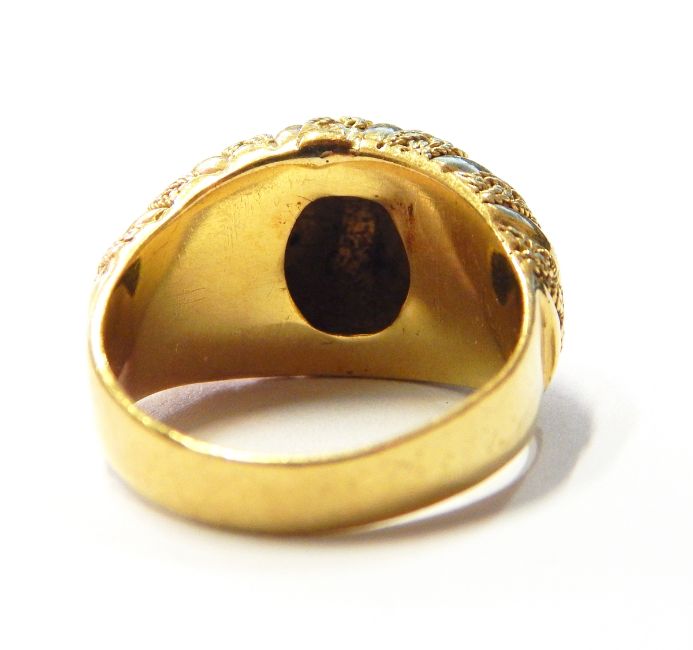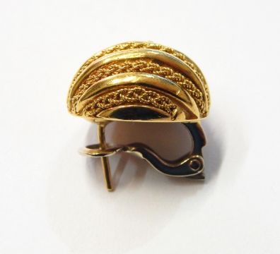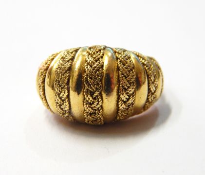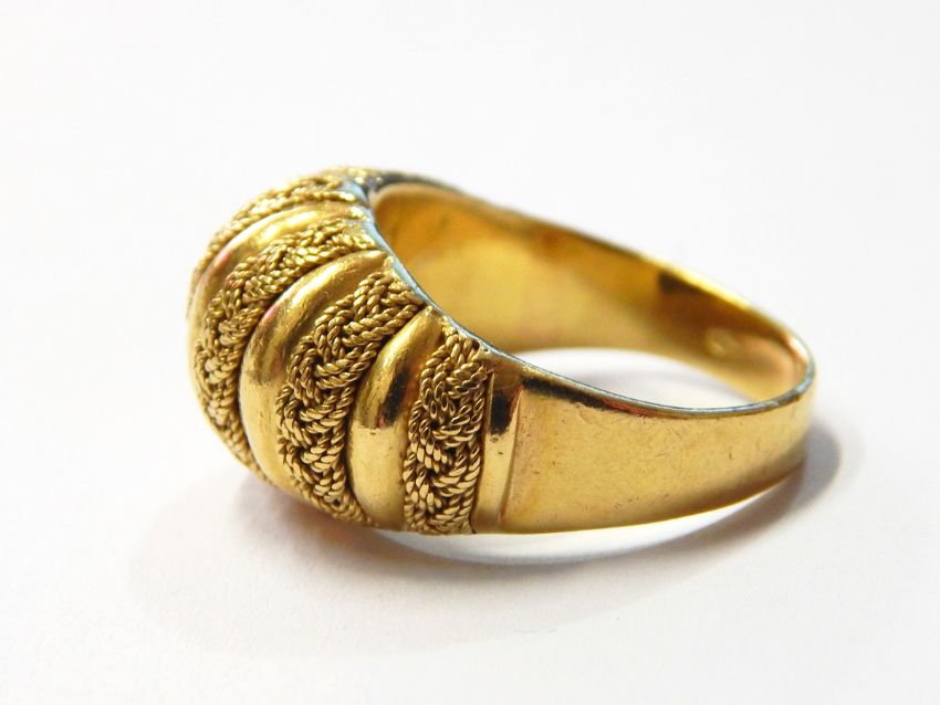 18ct gold dress ring, dome-pattern with woven plait and bar design and pair of matching circular domed earrings, 23g total approx.