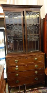 Georgian secretaire bookcase with stepped and dentil cornice, astragal-glazed panel doors, three shelves, secretaire drawer with satinwood vineering, leather inset with pigeonholes, three long drawers below, cockbead borders, on shaped bracket feet, 107cm wide