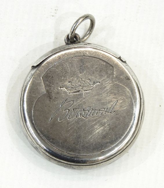 Victorian silver fob snuff box, London 1873 of plain circular form with hinged cover and gilt interior, engraved with coronet and inscribed "Bowmont", 5cm diameter
