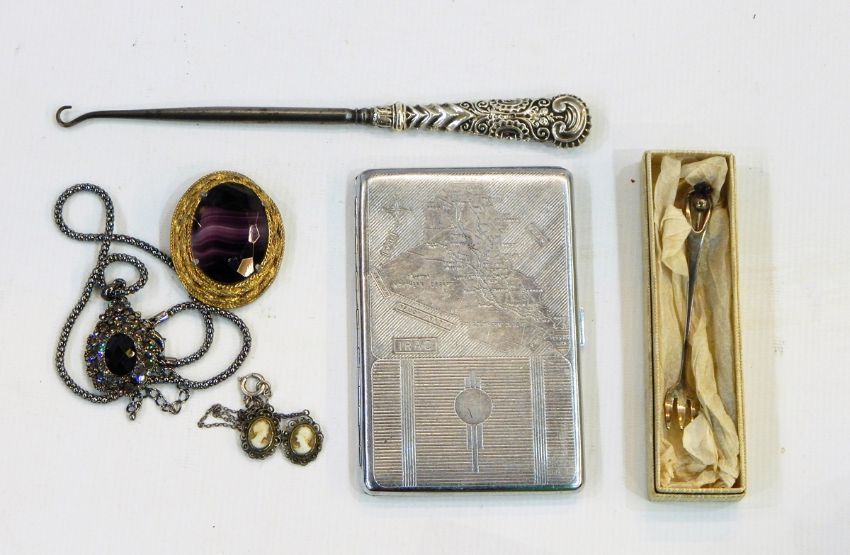Early to mid 20th century Emu brand chrome cigarette case of engine-turned rectangular form, the front engraved with a map of Iraq, silver-handled button hook, costume jewellery and other items