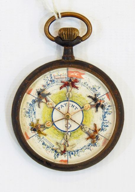 Patent watch case steeplechase gambling game with six horses, the horses are set in motion with a twist top winder, the one who stops just past the finish line wins