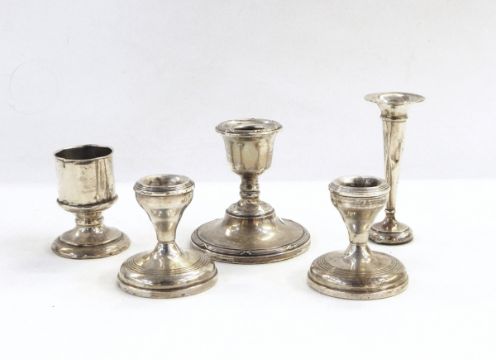 Pair of silver dressing table candlesticks of plain circular form, a single silver candlestick with ribbon borders, silver trumpet vase and one other item (5)