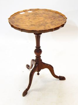 Burr walnut piecrust topped wine table on single reeded and bulbous support with carved cabriole legs and shaped feet, 40cm wide