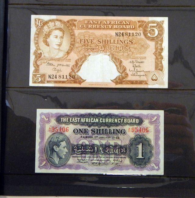 Four East African Currency Board banknotes comprising one George VI 5s note (1 September 1943, good), one Elizabeth II 5s note (1 January 1955, vf), one 1s note (1 January 1943, unc.), and a 5s note, cf. (4)