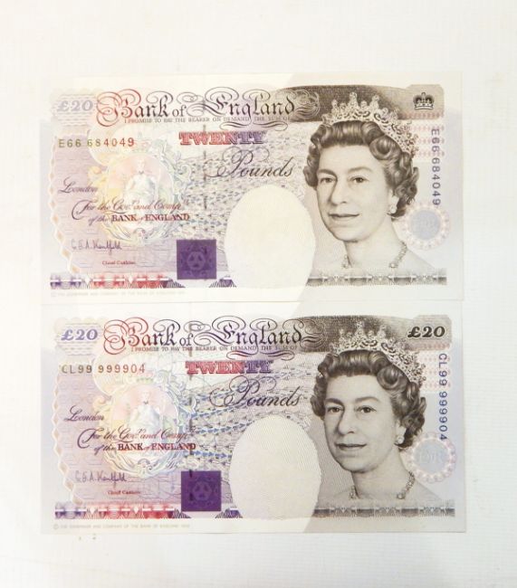 Two Bank of England £20 notes (November 1991 signed by G E A Kentsfield) unc. (2)