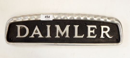 Daimler alloy radiator name plate, 39cm long and two other metal vehicle plates, one inscribed "CM", the other "301" (3)