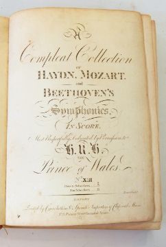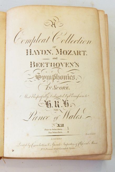 "The Compleat Collection of Haydn, Mozart and Beethoven's Symphonies in Score, most respectfully dedicated by permission to HRH The Prince of Wales", printed by Cianchellini & Sperati, Cavendish Square, vols 13, 14, 15, 16, 17 and 18 together bound but bdg completely loose and backstrip missing, front bd and back bd detached, contemporary bds with half leather but very rubbed and worn CONDITION REPORT: note: every page of every book is not checked, if you are unable to view yourself please ask for detailed information