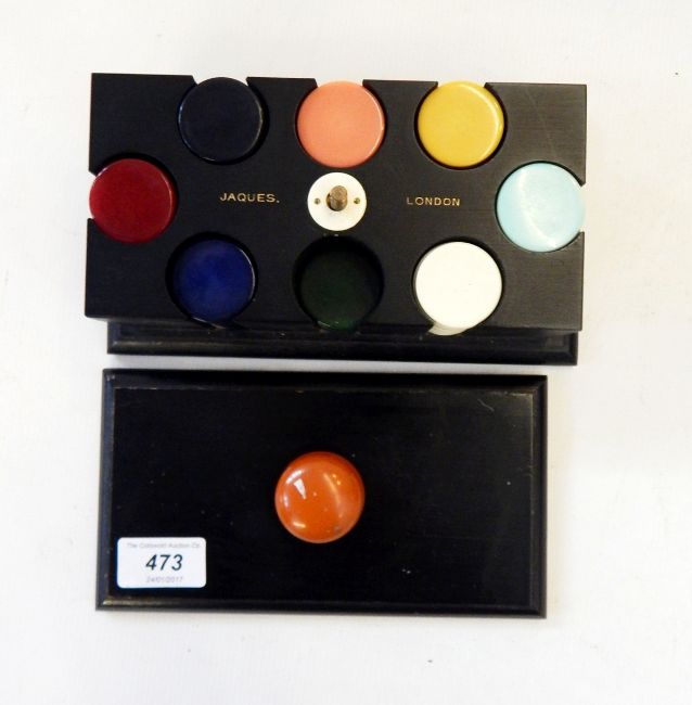 Jaques of London gambling chips/counters comprising eight sets of different coloured plastic counters, in rectangular ebonised frame (some counters missing)