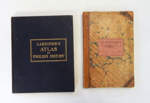 "Dr Brookes's General Atlas of Modern Geography containing 27 maps with the new discoveries and territorial arrangements", William Darton map seller at the repository of genius, 58 Hoburn Hill (not collated), numerous double page colour maps, ffep loose, contemporary marbled bds but rebacked and recornered, 1/2 leatherGardiner, Samuel Rawson"A School Atlas of English History", Longmans, Green & Co 1914 (2) CONDITION REPORT: note: every page of every book is not checked, if you are unable to view yourself please ask for detailed information