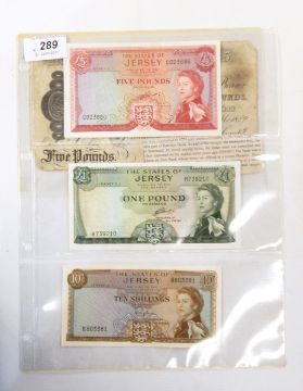 Three Jersey banknotes comprising one £5 note (1972 issue, ef) one £1 note (1972 issue unc), and one 10s note (1963 issue ef) and a £5 Darlington banknote (15 October 1889), (4)