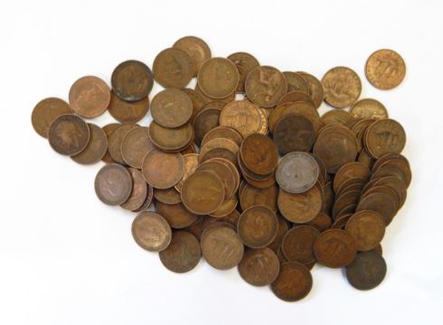Large quantity of pre-decimal pennies and half pennies (approx. 50), silver (approx 39) plus Edward IV groat and Elizabeth 1566 groat and two £1 pound notes
