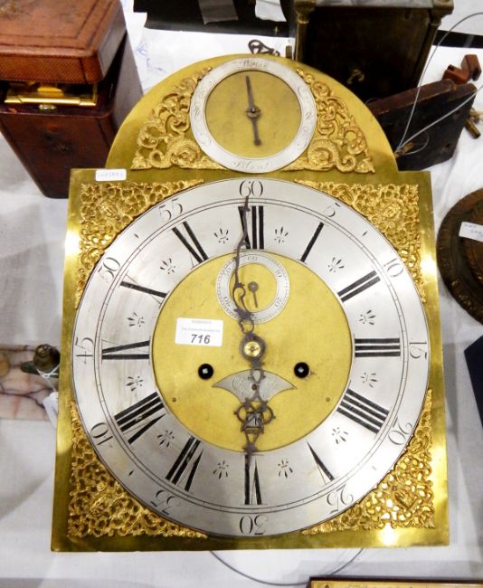 18th century eight-day longcase clock movement, the brass dial with silvered chapter ring, subsidiary seconds dial and date aperture, inscribed 'Collett, Chelsea', the arched pediment with strike silent dial, dial 29cm diameter