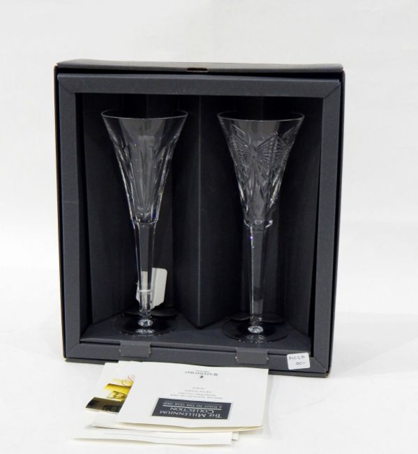 Set of 10 Waterford Millennium Collection 'A Toast to the Year 2000' toasting flutes in original boxes, a Millennium Collection champagne bottle coaster, a Waterford glass photograph frame, a pair of Waterford glass candlesticks and two other items