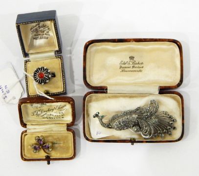 Marcasite brooch in the form of a peacock, a filigree ring marked 925 and a paste three-leaf clover brooch (3)
