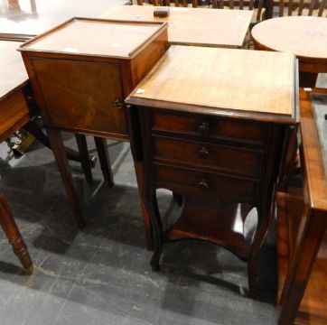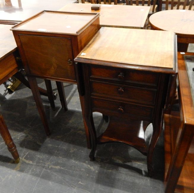 Walnut veneered fall-flap worktable fitted three drawers, on shaped supports, with under-tier and a 19th century mahogany pot cupboard on square tapering supports, 37cm wide (2)