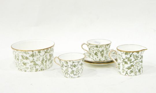 Victorian Wedgwood part tea service of fluted form, decorated with green flowers, on a white ground, comprising teacups and saucers, bowl, jug, side plates, etc. and another Victorian part tea service decorated with pink and gilt borders