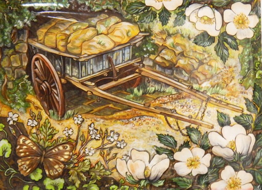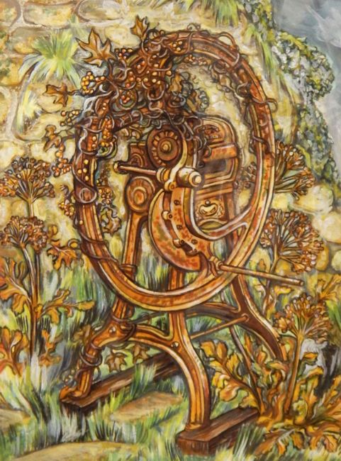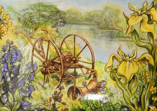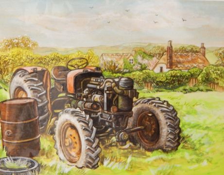 Catherine Adeane Five watercolours Old farm machinery in landscapes, one signed