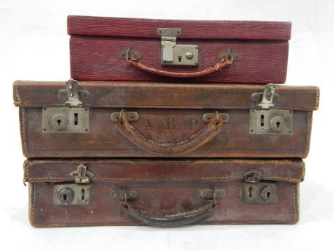 Red leather writing suitcase with fitted interior and two small brown leather suitcases (3)