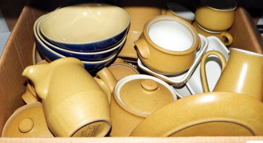 Denby part dinner and tea service, ochre with white insides and three blue Denby bowls with yellow insides