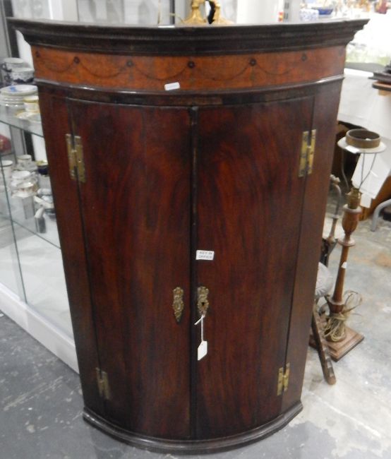 19th century mahogany corner cabinet, tooth moulding cornice, walnut, boxwood and satinwood decoration, 71cm