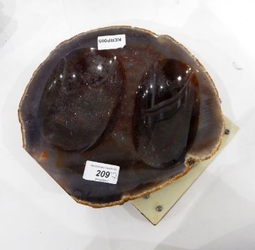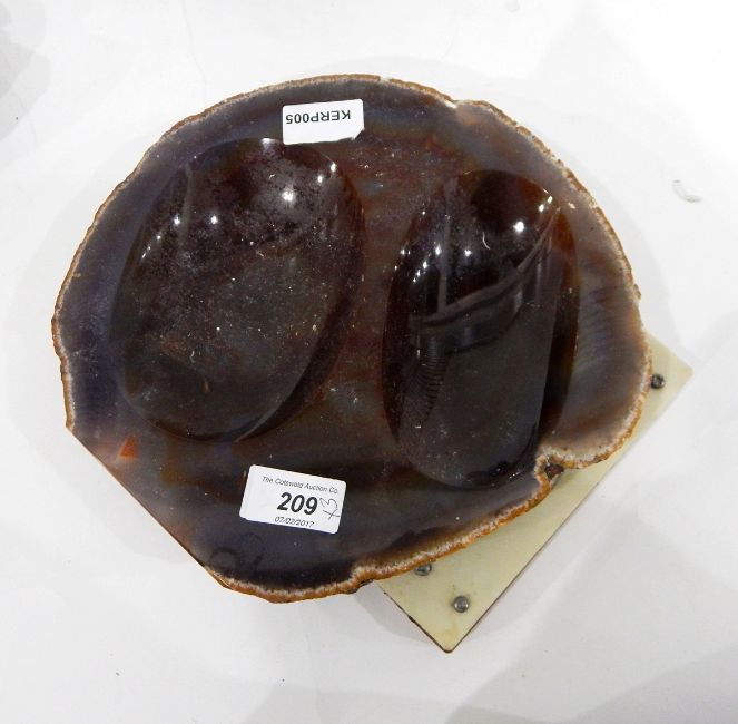 Amethyst geode, 31cm long, another crystal geode and a circular piece of agate with polished recesses (3)