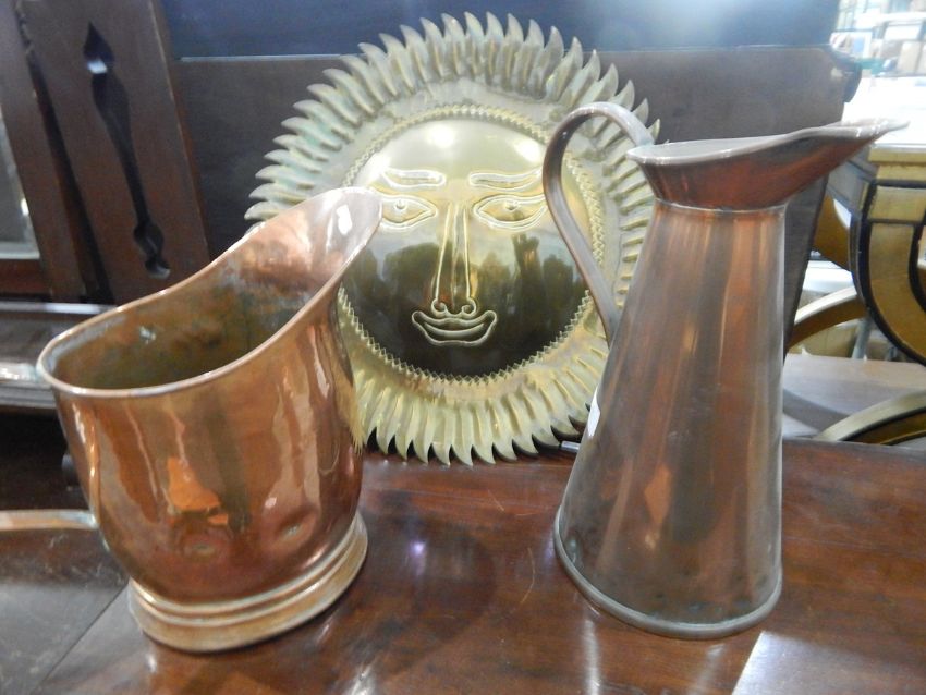 Globe, various metalware items including copper ewer and a copper jug, a large jardiniere and other items