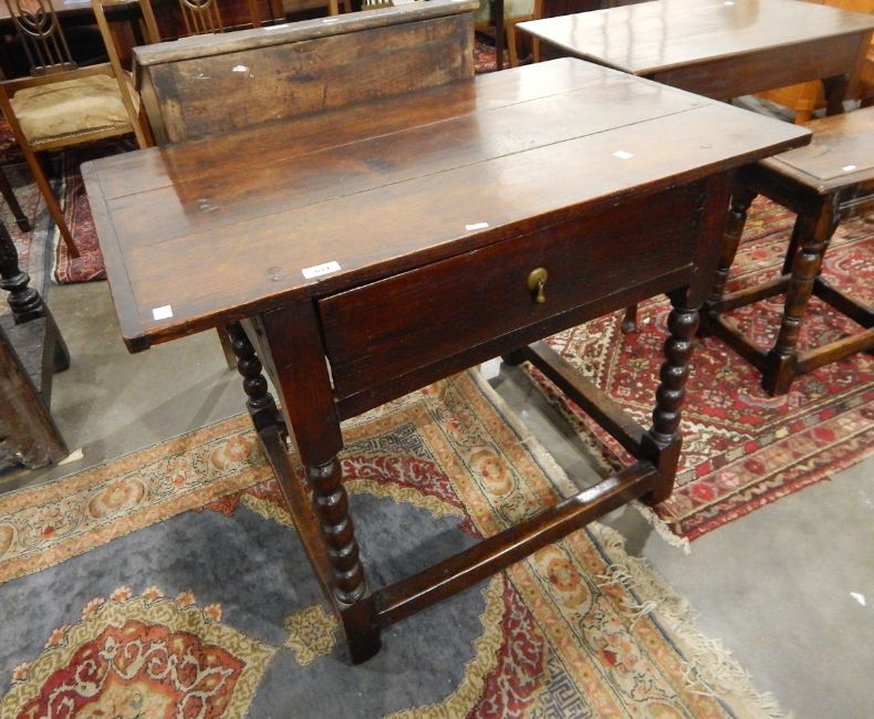 Antique oak side table with single frieze drawer, on bobbin and block supports, 95cm wide