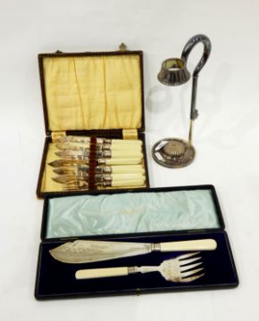 EPNS bottle holder/pourer with adjustable height, a boxed set fish servers and a boxed set of fish knives and forks