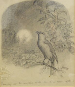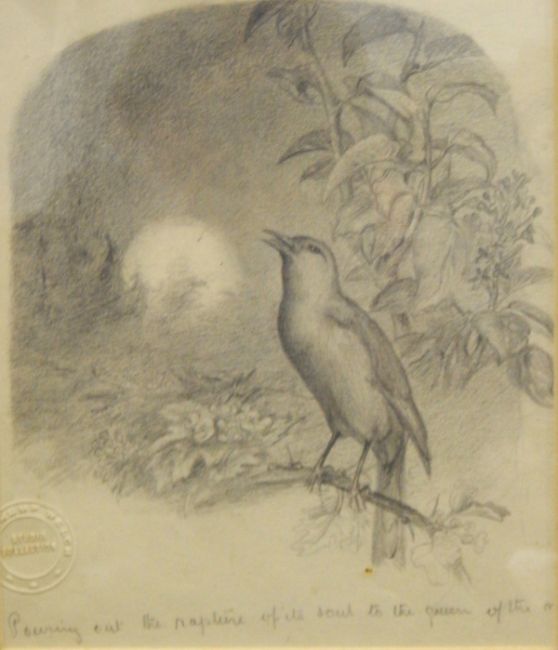 Lucy Elizabeth Kemp-Welch (1869-1958)Pencil drawingSongbirds dawn chorus resting on branch with sun coming up in distance, entitled in pencil 'pouring out the rapture of its soul to the queen of the ... the morning' bearing Kemp-Welsh's studio embossed stamp, David Messum exhibition label to verso, 18 x 16cm