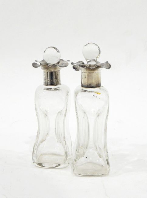 A pair of glass scent bottles of waisted form, with silver collars, Birmingham 1926 by William Devenport, 13cm high