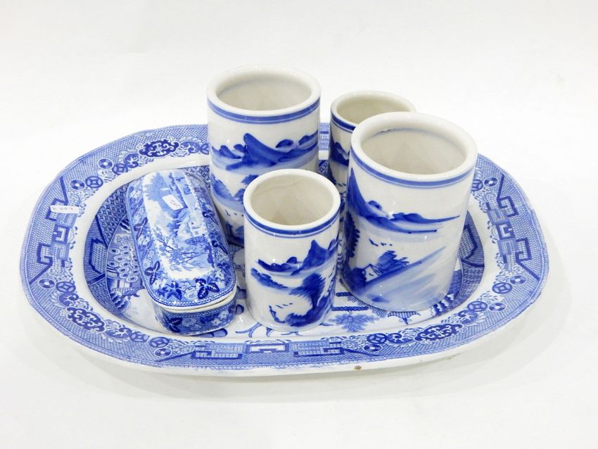 Victorian blue and white meat plate, a Victorian blue and white tureen and cover, six blue and white cylindrical vases and two other items (10)