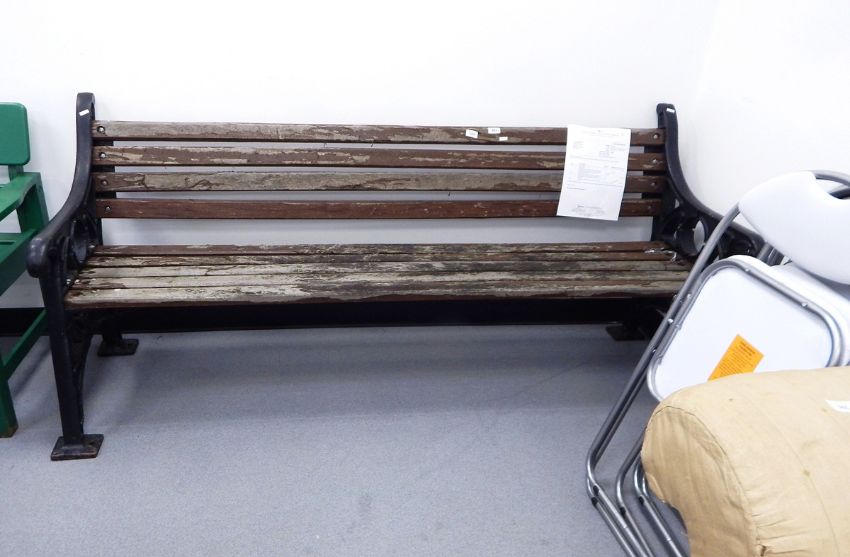 A slat back Coalbrookdale-style cast iron garden bench