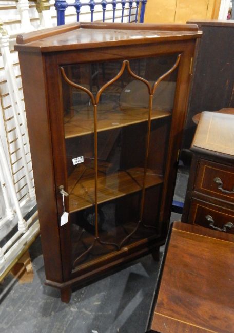 Mahogany-finish dwarf standing corner display cupboard enclosed by bi-glazed door, 63cm wide, a modern reproduction four-drawer bowfront bedside chest and a cross-banded mahogany-finish telephone/lamp table fitted a drawer, on lyre-shaped standards, reeded swept supports, brass hare claw feet (3)