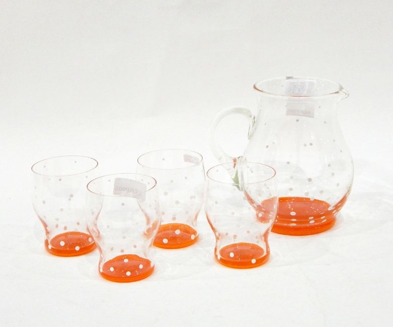 Glass lemonade set comprising jug and four tumblers, painted with white polka dots and orange bases (5)