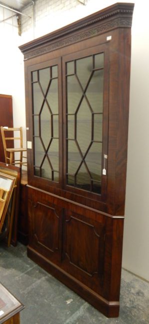 19th century mahogany standing corner cupboard, the upper section with dentil cornice and blind fret frieze, three shaped shelves enclosed by pair astragal-glazed panel doors, cupboard below, all on plinth base, 137cm wide