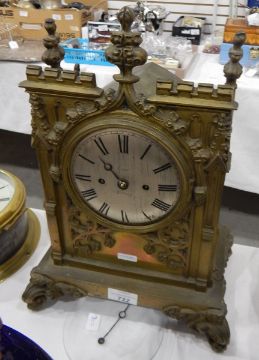 Victorian Gothic revival brass mantel clock, the silvered dial with Roman numerals and inscribed 'Crew, Tetbury', the brass case of architectural design, 43cm high