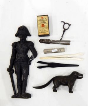 Metal nutcracker in the form of a dog, inscribed "Made in England", a doorstop modelled as a figure in uniform, glove stretchers and other items