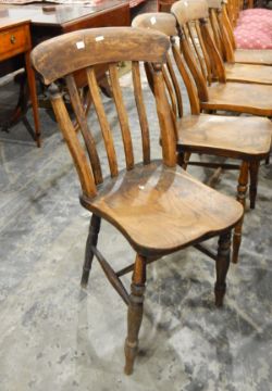 Set of five elm kitchen chairs with lath backs, on bobbin and turned supports, united by H-stretchers (5)