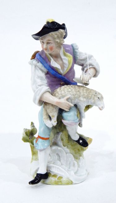 Continental porcelain figure of a man seated on a tree stump shearing sheep, with underglaze blue Augustus Rex monogram, 24cm high