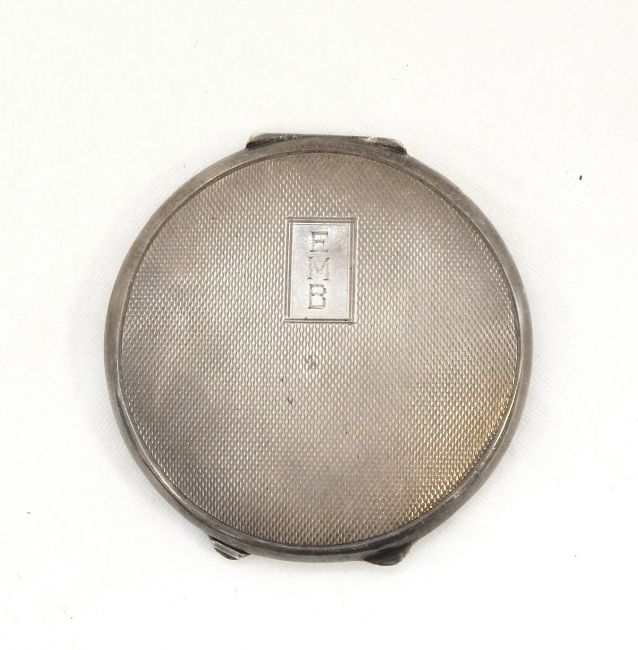 George VI lady's silver compact of circular form with engine-turned engraving, mirrored interior, 6.5cm diameter, Birmingham 1946