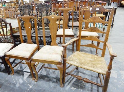 Arts & Crafts style ladderback carver chair with rush seat, on circular supports