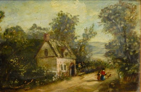 Oil on boardCountry landscape with cottage and figures, 10cm x 15cm 19th century school Watercolour drawing Country road, women on cart with lake in distance, 12cm x 16cm (2)
