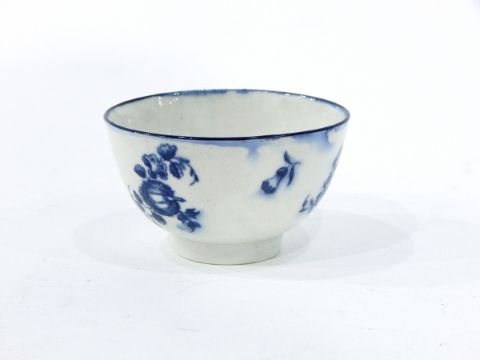 18th century blue and white tea bowl, probably Caughley decorated with the fruit sprigs pattern, underglaze crescent mark to base, 7.5cm diameter and a saucer in the same pattern (small chips and scratches) (2)
