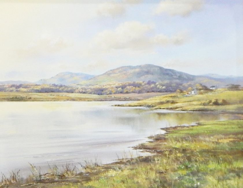 Alan Morgan (20th century) Oil on canvas Lochside landscape with cottages and hills in distance, signed bottom right, 40cm x 48cm