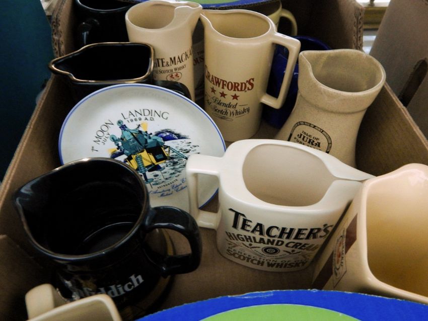 A large quantity of pub advertising jugs ie Crawford's Five Star Cream, Glenfiddick Malt Whisky, the Original McKinley Whisky , a souvenir plate for 'The First Moon Landing July 1969 AD', a brass post horn and other items ( 3 boxes)