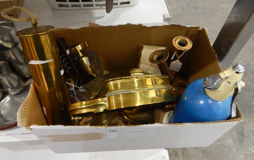 Brass inkstand of oval form with hinged cover revealing a glass inkwell, matching pen holder and roller blotter (3)
